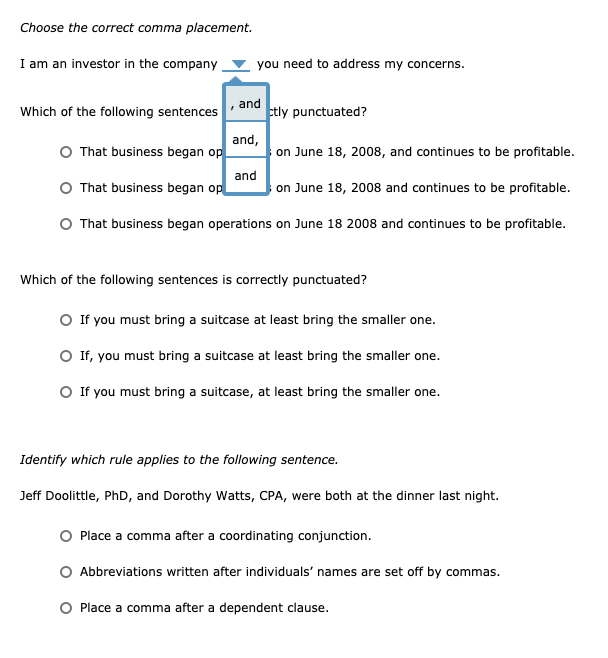 Hence the given sentence required 3 punctuation marks and it is given. That business began operations on June 18 2008 and continues to be profitable. C- Students are concerned about their upcoming exam they are.